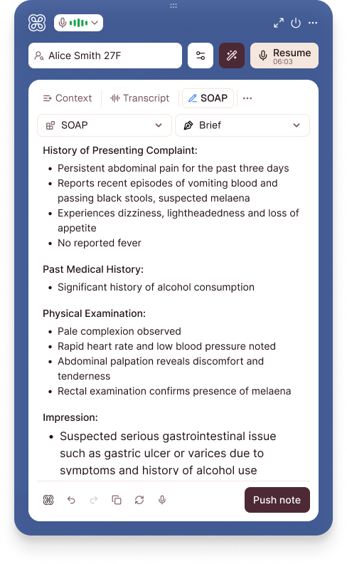 Heidi's AI technology embedded seamlessly into the Elixir platform, enabling efficient and accurate medical documentation.